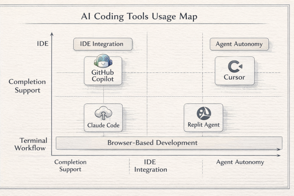 開発経験が浅いなら、GitHub Copilot のような補完寄りか、Replit Agent のようなブラウザ完結型から入るほうが無理がありません。エージェント型は便利ですが、出力の妥当性を見極める理解があると使いやすさが上がります。