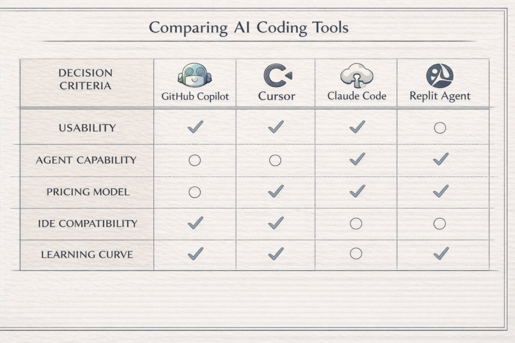代表的な候補として挙がりやすいのが、Cursor、GitHub Copilot、Claude Code、Replit Agent の4つです。