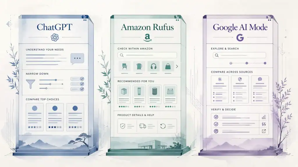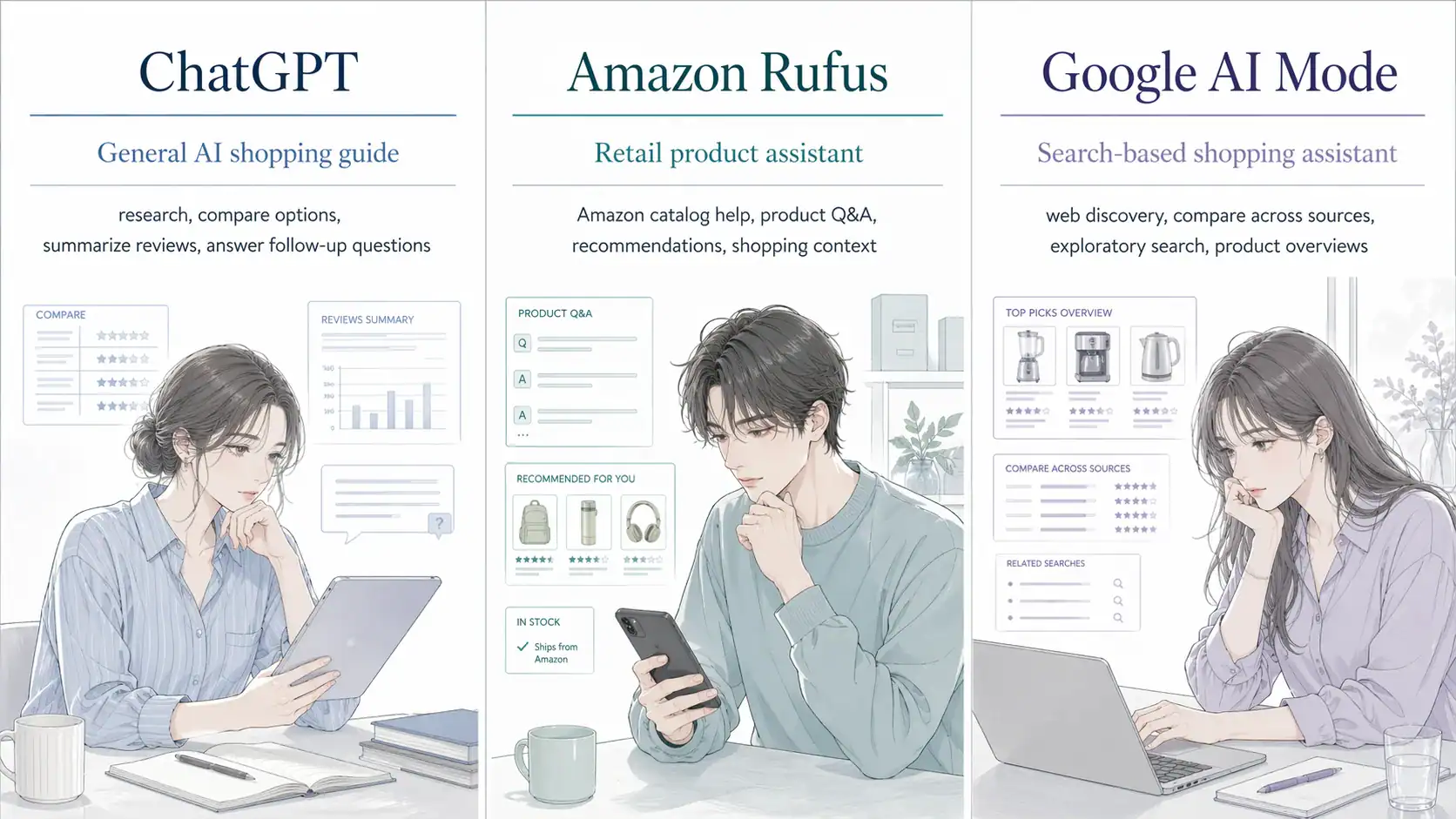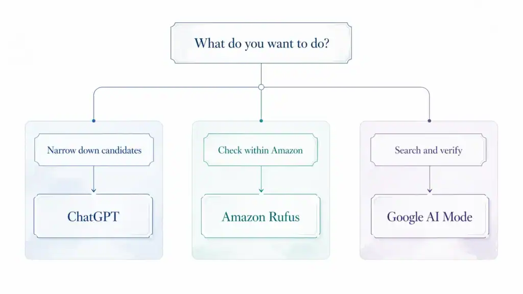 比較条件を整理しながら候補を絞りたい人は ChatGPT(Shopping機能)、Amazon内で商品を確認しながら判断したい人は Amazon Rufus、Google検索結果を見ながら深堀りしたい人は Google AI Mode が向いています。
