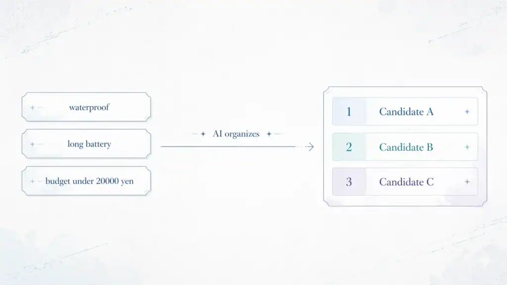 ChatGPTのShopping機能(shopping research)は、複数の商品を比較したい人、条件が複数ある人に向いています。「防水で、バッテリーが長持ちで、2万円以内のイヤホン」といった複合条件も整理してくれます。