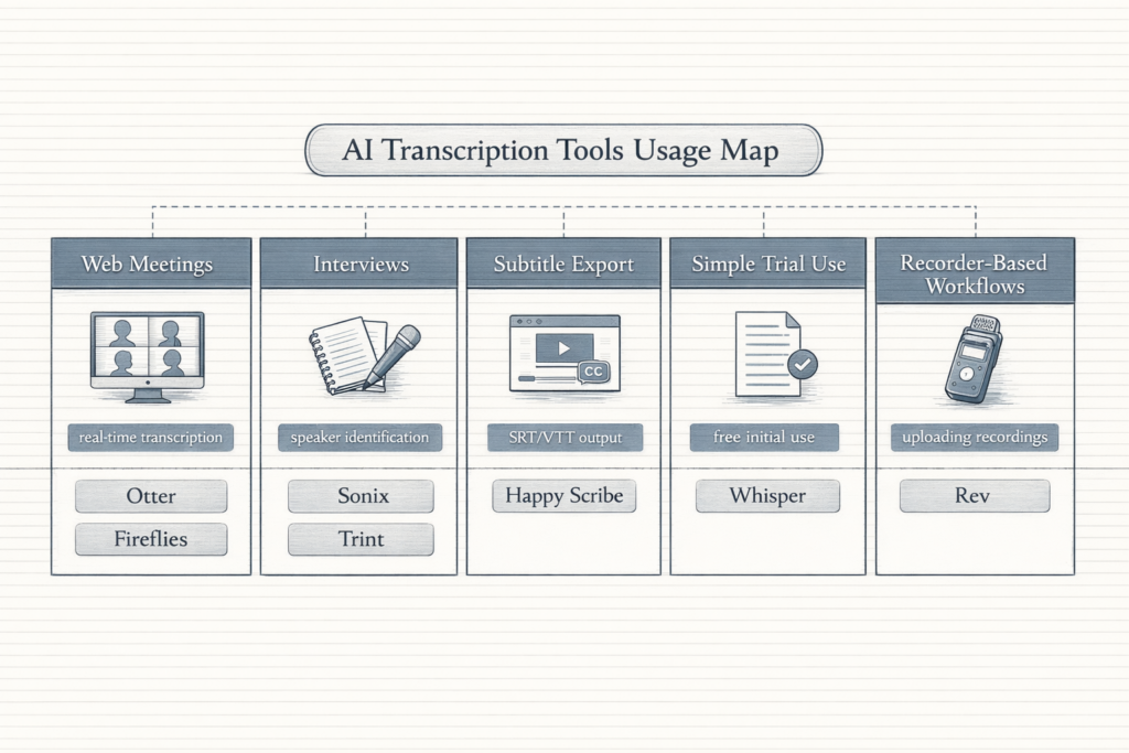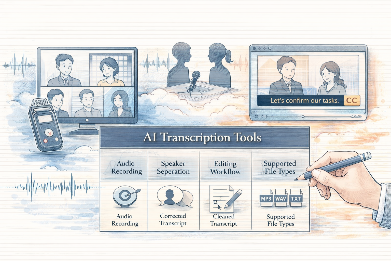この記事では、主要なAI文字起こしツールを比較軸ごとに整理し、会議、インタビュー、動画のどの場面に何が向くのかをまとめます。