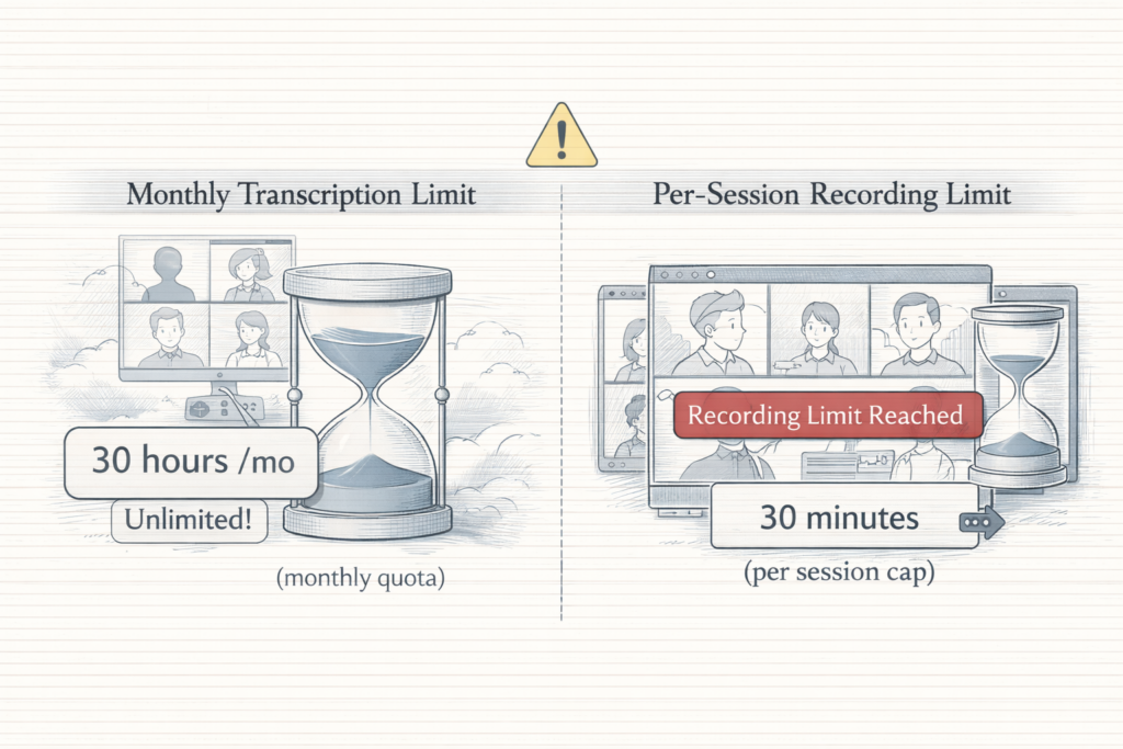 たとえば Notta は pricing ページでは 120分/月と見えますが、1録音あたりは3分までです。月間分数だけを見て長時間会議に使うと、途中で止まる可能性があります。LINE WORKS AiNote は 300分/月、1回60分、AutoMemo は 1時間/月が確認できます。Rimo Voice は料金ページで無料開始導線はありますが、無料枠の細部は利用時点で確認したほうが安全です。