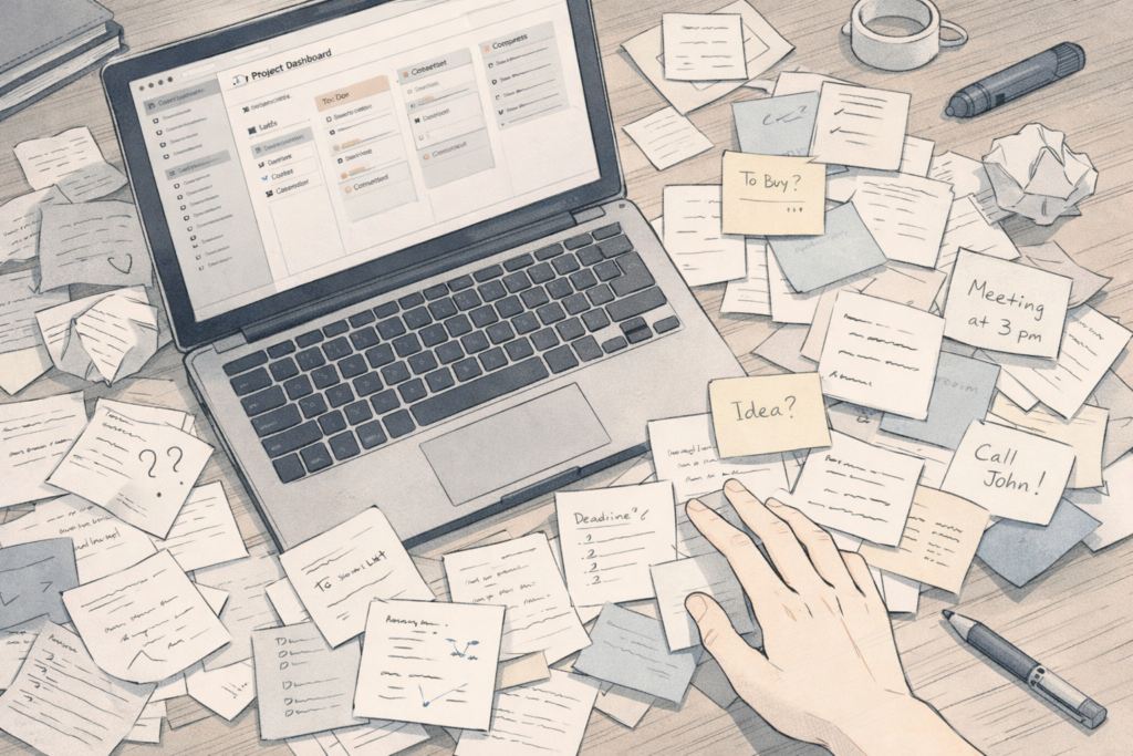 Notionを使っているけれど、メモが増えるだけで後から活用できていない。タスクとメモが別々になっていて、どこに何があるかわからない。こうした状態に覚えがある方は多いと思います。