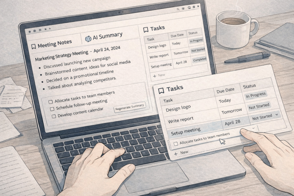 Notion AIは、すべてを自動でやってくれる魔法ではありません。ただ、「書いて終わり」を「書いて使う」に変える仕組みを作りやすい点は大きな強みです。