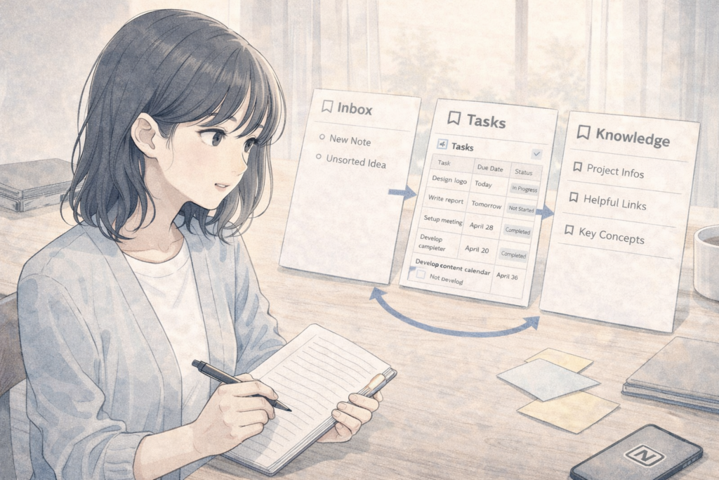 メモが増えるにつれて、どこに何があるかわからなくなります。すると、AIに整理を頼んでも出力が安定しにくくなります。Notion AIを活かすには、「何をどこに置くか」を先に決めておくことが大切です。