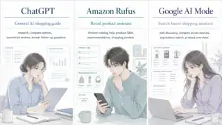 AIツール比較 AIショッピングアシスタント比較|ChatGPT・Amazon Rufus・Google AI Modeの違いと選び方 AIで買い物を効率化したい人向けに、ChatGPT・Amazon Rufus・Google AI Modeの違いを整理。比較条件の絞り方、Amazon内での使い方、販売ページを見ながら深掘りする方法まで、選び方と注意点を初心者向けにわかりやすく解説します。 2026.04.23 AIツール比較AI活用