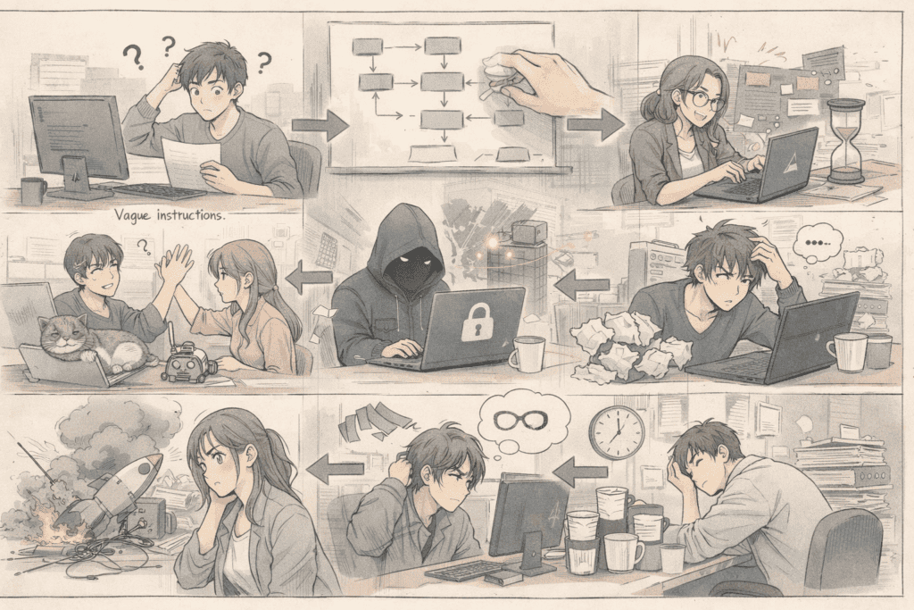 バイブコーディングで最もよくある失敗の原因は、指示の曖昧さです。「ログイン機能を作って」だけでは、AIはさまざまな解釈をします。どこでログインするのか、どんな認証方式か、エラー時の処理は必要か、セッション管理はどうするか、といった要件が未定義のまま進むと、意図と違うコードが生成されます。