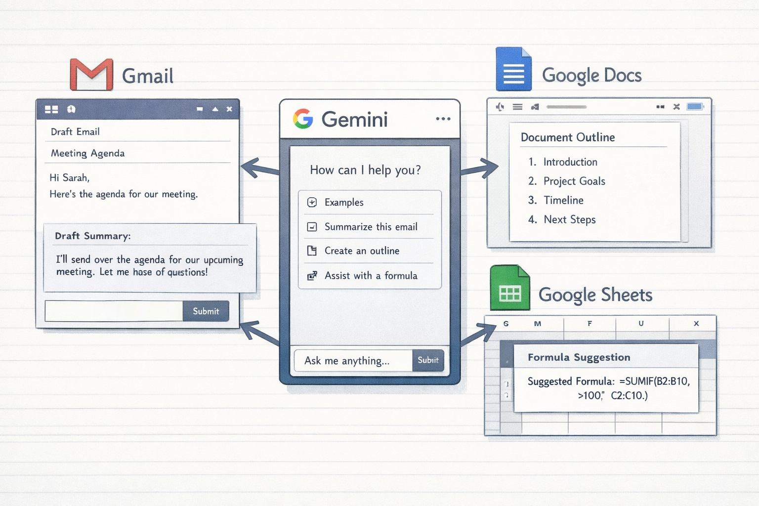 Gmail、Googleドキュメント、スプレッドシートなどで、下書き、要約、整理、分析を補助します。