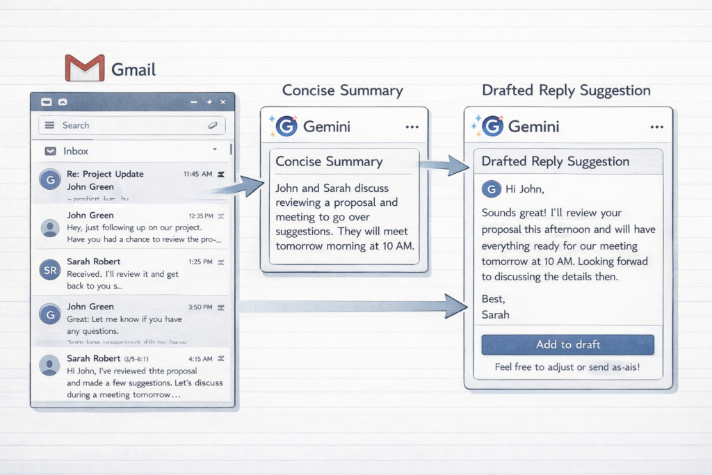 Gmail における Gemini の主な用途は、メールの下書き生成、返信文の補助、スレッド要約です。