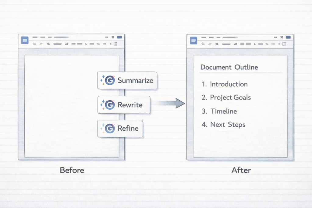Google Workspace の Gemini は、Gmail、Googleドキュメント、Googleスプレッドシートなどで、下書き、要約、整理、関数補助を行えるAI補助です。
