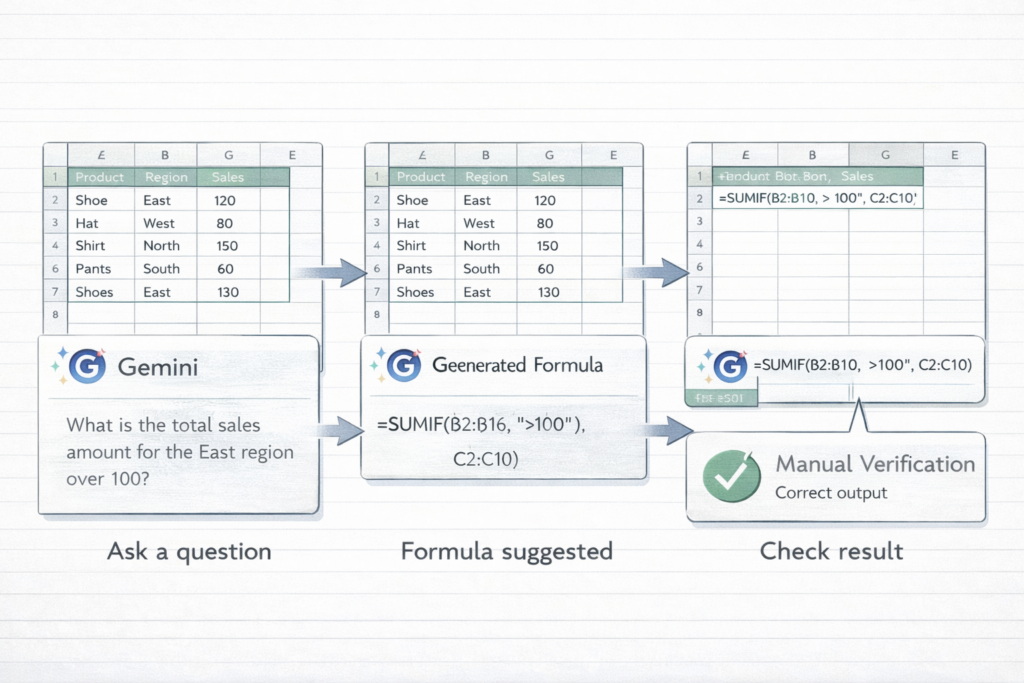 Gemini に自然文で依頼すると、SUMIF、COUNTIF、IF、VLOOKUP などの関数の叩き台を出してもらえることがあります。