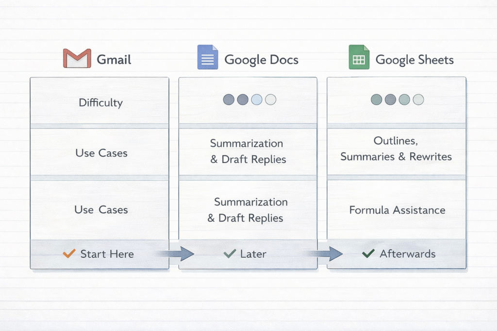 Gmail は元の作業フローを大きく変えずに試しやすく、Gemini の使い心地を把握しやすいです。その後に Docs で文章作成へ広げ、最後に Sheets で数式や分析補助へ進むと、つまずきにくくなります。